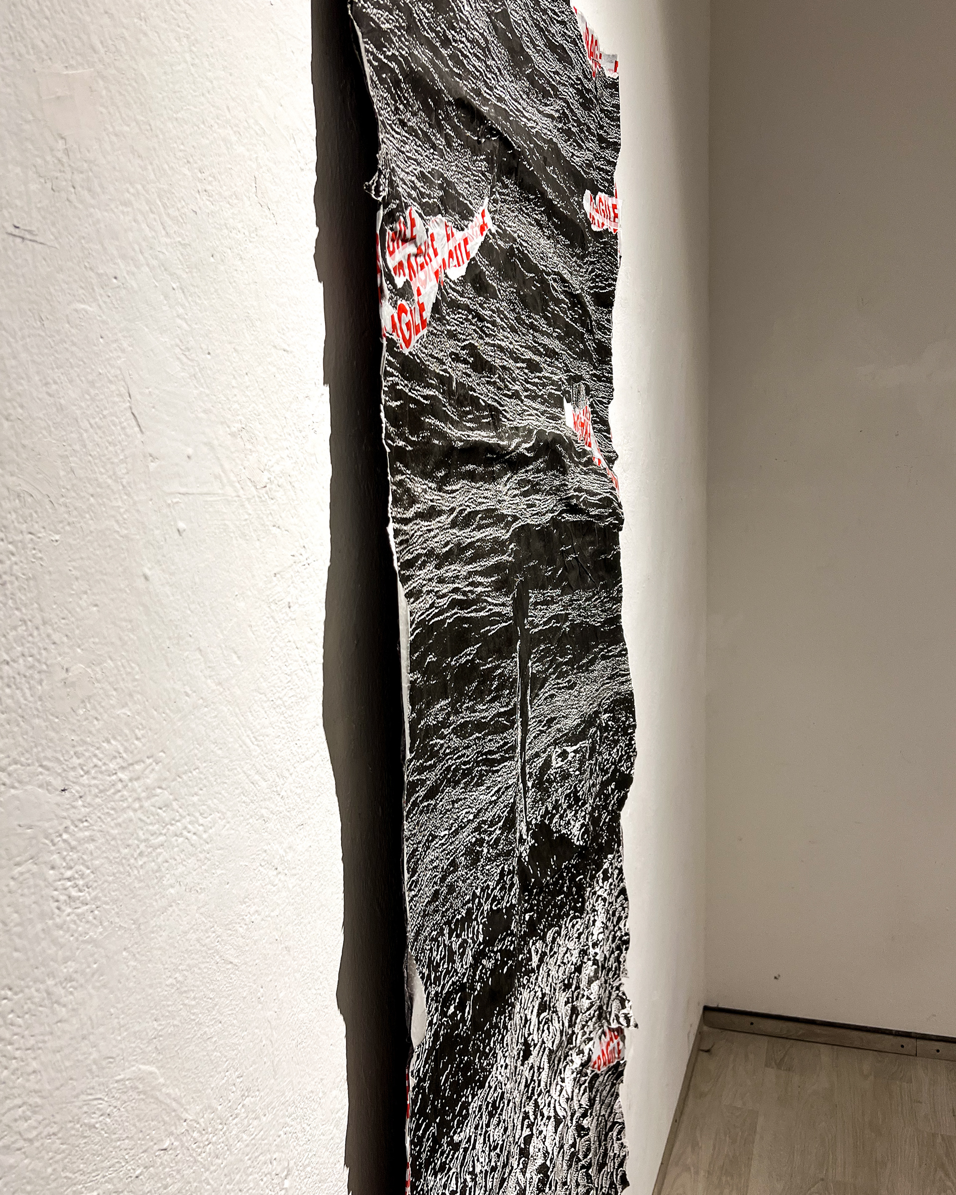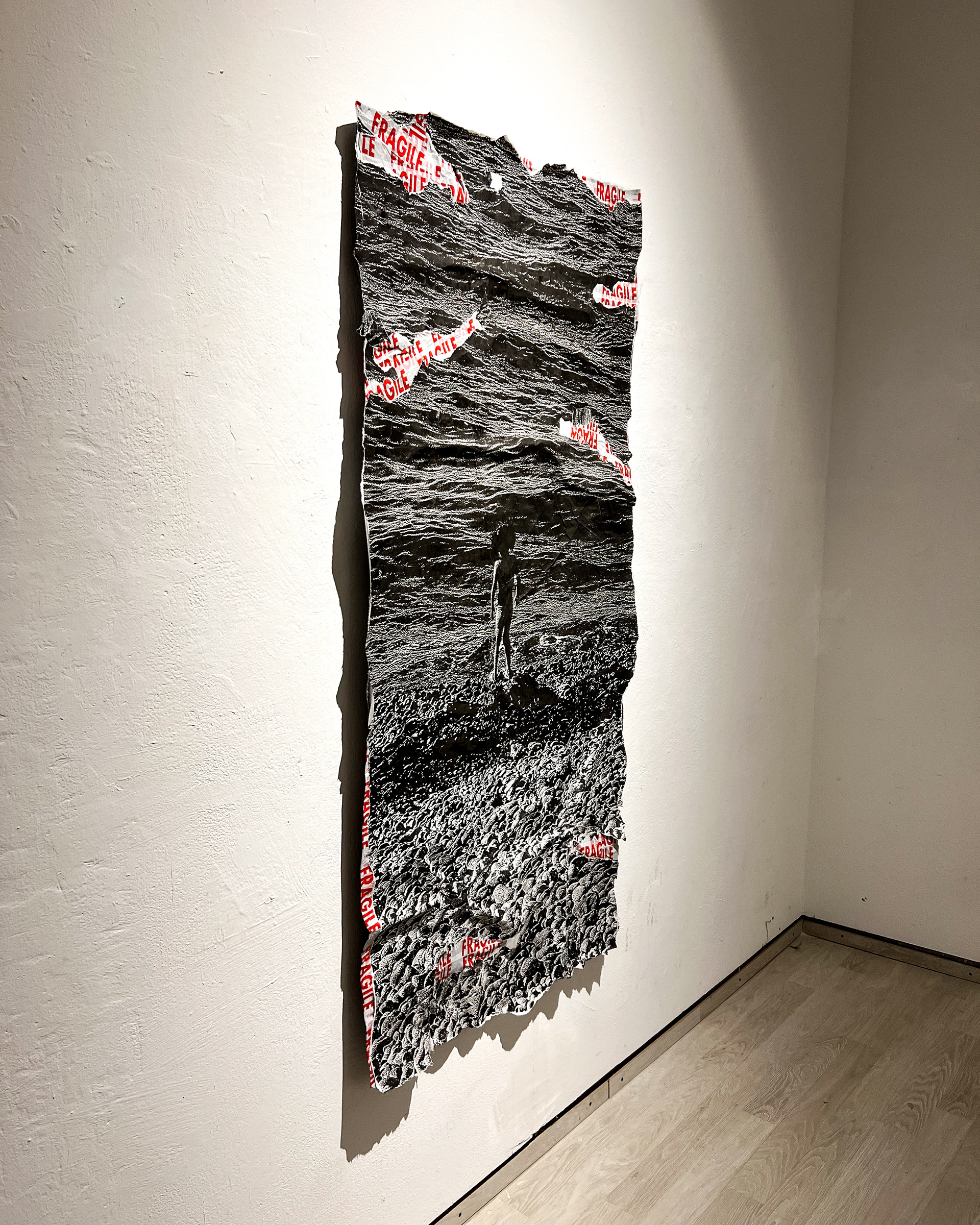 photographic print on acrlylic fabric, 200×175 cm Il sale. Sono violini, e voci quelle del mare. Sono cristalli di sale. Chiare emozioni di solitudine e pace. Forze distruttive e membrane. Brandelli di pelle come luce si staccano dal corpo, come al tramonto, come l'ultimo spicchio di mare. Ripongo i miei pensieri in bare di sale, i ricordi che faccio essiccare spero in futuro di consumare. 1 canti e i violini ascolto sulla spiaggia, guardando giù, guardando quello che c'era e non torna più. Ti chiamo da lontano, spero che tu mi senta Se senti un vento salato forse potrei essere io. Forse se ti giri ti puoi lasciare trasportare.